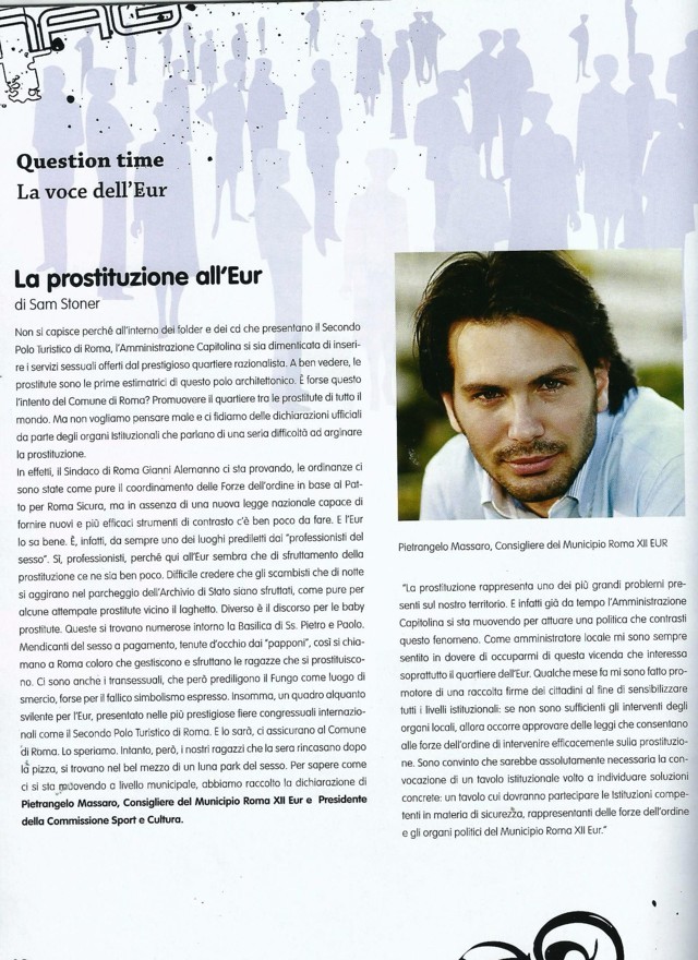Comunicati, media e notizie RomaPolitica sul territorio E42 Magazine Roma – La prostituzione all’Eur L'articolo della rivista E42 Magazione Roma sul problema della prostituzione per strada all'Eur. L'intervista del…Pietrangelo Massaro15 Aprile 2011