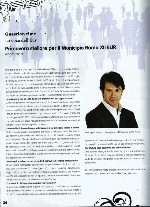 Comunicati, media e notizie RomaRoma e il bello che c'è E42 Magazine Roma – Primavera stellare per il Municipio XII Roma Eur L'intervista di E42 Magazine Roma al Consigliere Municipale Pietrangelo Massaro in merito alle iniziative sportive…Pietrangelo Massaro15 Giugno 2011