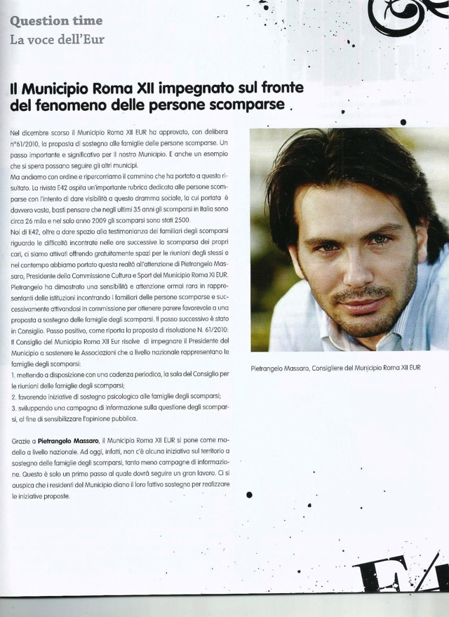 Comunicati, media e notizie RomaPolitica sul territorio E 42 Magazine Roma – Il Municipio Roma Eur impegnato sul fronte del fenomeno delle persone scomparse E42 Magazine Roma intervista il Consigliere Municipale Pietrangelo Massaro sulle iniziative che sta promuovendo rispetto…Pietrangelo Massaro15 Febbraio 2011